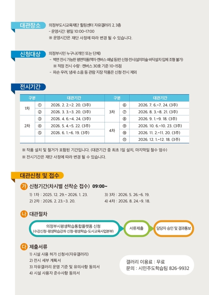 [의정부=뉴스핌]신선호 기자=의정부도시교육재단은 23일 시민의 다양한 창작물을 전시할 수 있는 상설 전시 공간 '자유갤러리'를 조성하고 29일부터 의정부시민을 대상으로 2026년 자유갤러리 이용 신청을 받는다고 밝혔다.