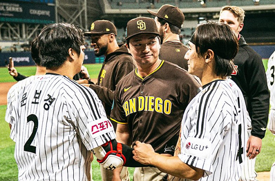 고우석(가운데)이 2024 MLB 월드투어 서울시리즈 당시 문보경, 신민재 등 LG 동료들과 반갑게 얘기를 나누고 있다. [사진=샌디에이고 홈페이지]