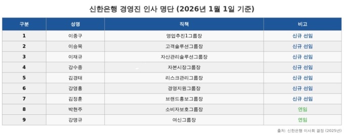 [서울=뉴스핌] 채송무 기자 = 신한은행은 23일 전사 혁신을 총괄하는 미래혁신그룹을 신설하는 조직 개편과 함께 신규 선임 경영진 7인을 포함한 9인의 경영진 인사를 단행했다.