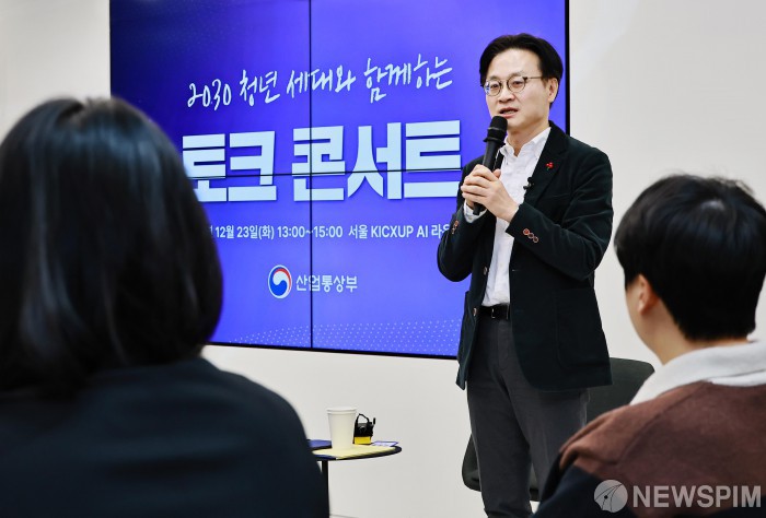 [서울=뉴스핌] 김정관 산업통상부 장관이 23일 서울 구로구 구로디지털단지 지타워 킥스업 AI라운지에서 열린 2030 청년세대 토크콘서트에서 인사말을 하고 있다. [사진=산업통상부] 2025.12.23 photo@newspim.com