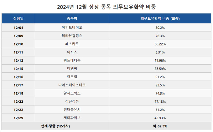 12월 상장된 기업들의 의무보유확약 비중을 조사한 결과 평균 의무보유확약 비중은 약 62.3%로 집계됐다. 이는 제도 시행 직후인 11월 평균(48.1%)을 10%p 이상 상회하는 수치이며, 상반기 평균(9.8%)과 비교하면 6배가 넘는 폭증세다.