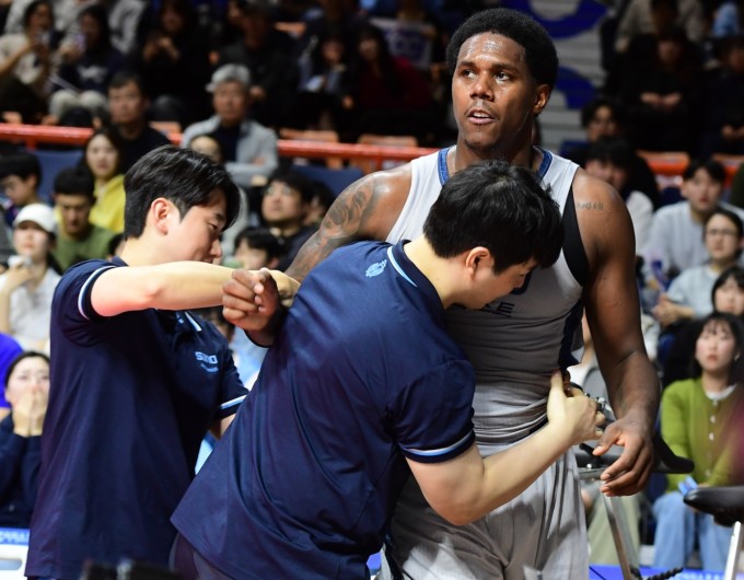 [서울=뉴스핌] 박상욱 기자 = 네이던 나이트가 20일 프로농구 정규리그 부산 KCC전 4쿼터 도중 선수와 동료의 만류에도 분을 삭이지 못하고 항의를 하고 있다. [사진=KBL] 2025.12.23 psoq1337@newspim.com
