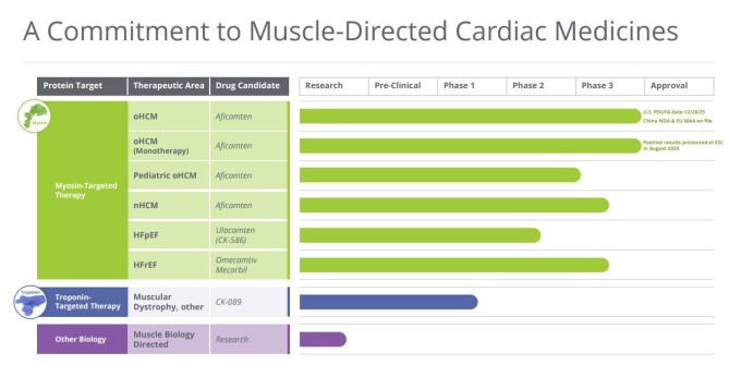 회사의 주력 약물인 아피캄텐(마이코르조, MYQORZO)는 성인 증상성 폐쇄성 비대성 심근병증(oHCM) 환자의 기능적 능력과 증상 개선을 목적으로 승인받았다. 이 약물은 심장 근육의 과도한 수축성을 감소시켜 비대성 심근병증을 치료하도록 설계된 선택적 심장 미오신 억제제이다.