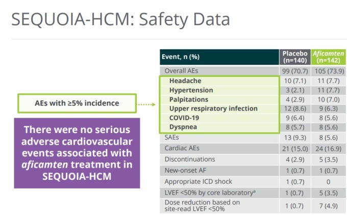 고혈압은 마이코르조 투여군에서 8%, 위약군에서 2%로 나타나 5% 이상 발생한 유일한 이상반응이었다. 전문가들은 이를 좌심실 유출로(LVOT) 폐쇄 완화와 심박출량 개선에 따른 자연스러운 생리학적 반응으로 해석하고 있다.
