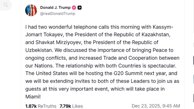 트럼프 대통령은 23일(현지시간) 카심조마르트 토카예프 카자흐스탄 대통령, 샤브카트 미르지요예프 우즈베키스탄 대통령과 각각 전화 통화를 한 뒤 이 같은 계획을 발표했다. 그는 자신의 소셜미디어 트루스 소셜에 올린 글에서 "두 나라와의 관계는 환상적(spectacular)"이라며 "무역과 협력을 확대하고 평화를 증진하는 논의를 나눴다"고 밝혔다.