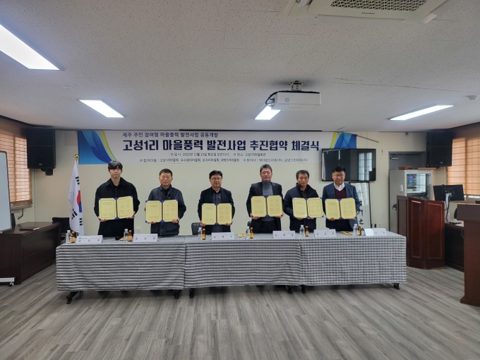 [서울=뉴스핌] 김연순 기자 = 금양그린파워(주)는 지난 23일 제주 제주시 애월읍 고성1리 마을회관에서 마을회, 제이윈드파워와 '고성1리 마을풍력 발전사업' 추진협약을 체결했다고 24일 밝혔다.