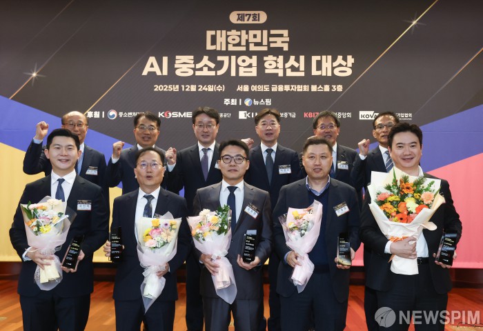 [서울=뉴스핌] 최지환 기자 = 유근석 뉴스핌 대표(뒷줄 왼쪽 끝)가 24일 오전 서울 영등포구 금융투자협회에서 뉴스핌 주최로 열린 대한민국 AI 중소기업 혁신 대상에서 참가자들과 기념촬영을 하고 있다. 뒷줄 왼쪽부터 시계방향으로 유근석 대표, 정운열 중소기업중앙회 디지털혁신본부장, 이창섭 중소벤처기업진흥공단 기획관리이사, 박용순 중소벤처기업부 중소기업정책실장, 이상창 기술보증기금 상임이사, 유정희 벤처기업협회 혁신정책본부장, 이영준 모두싸인 대표, 김종래 원포유 전무, 김동환 포티투마루 대표, 김성엽 포시에스 상무, 국진혁 이노바이드 대표. 2025.12.24 choipix16@newspim.com