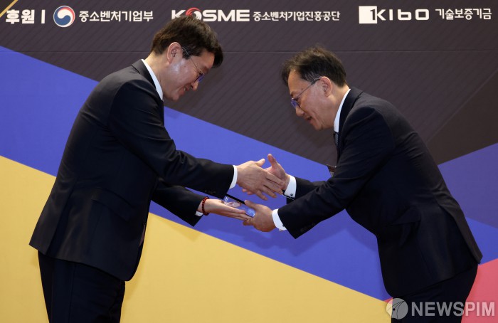 [서울=뉴스핌] 최지환 기자 = 이창섭 중소벤처기업진흥공단 기획관리이사가 24일 오전 서울 영등포구 금융투자협회에서 뉴스핌 주최로 열린 대한민국 AI 중소기업 혁신 대상에서 김성엽 포시에스 상무에게 중소벤처기업진흥공단 이사장상을 시상하고 있다. 2025.12.24 choipix16@newspim.com