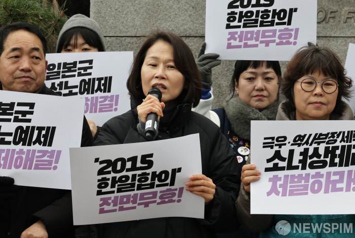 [서울=뉴스핌] 양윤모 기자 = 2015년 한일 일본군 '위안부' 합의가 체결된 지 10년을 앞둔 24일 오전 정의기억연대와 한일역사정의평화행동 등 시민단체 회원들이 서울 종로구 외교부 앞에서 한일합의 전면 무효·소녀상 테러 처벌·일본군 위안부 피해자 보호법 개정 촉구 기자회견를 개최하고 있다. 2025.12.24 yym58@newspim.com