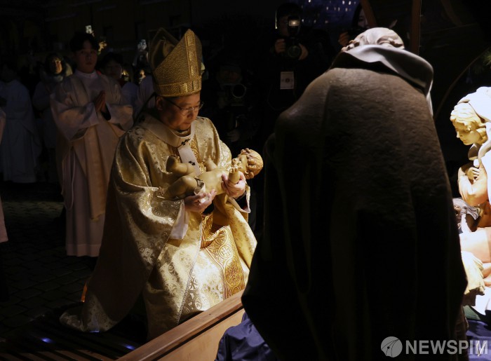 [서울=뉴스핌] 최지환 기자 = 천주교 서울대교구장 정순택 대주교가 25일 새벽 서울 중구 명동대성당 앞마당에서 아기 예수를 말 구유에 안치하는 '구유 예절' 의식을 행하고 있다. 2025.12.25 choipix16@newspim.com