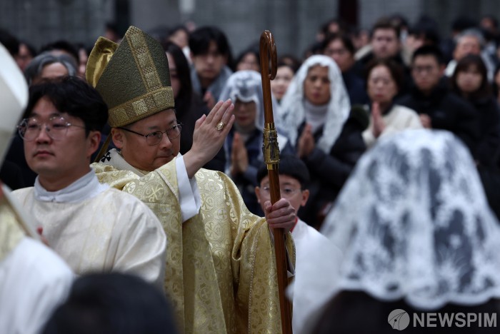[서울=뉴스핌] 최지환 기자 = 정순택 천주교 서울대교구 대주교가 성탄절인 25일 새벽 서울 중구 명동대성당에서 주님 성탄 대축일 밤 미사에 입장하고 있다. 2025.12.25 choipix16@newspim.com