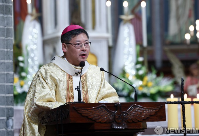 [서울=뉴스핌] 최지환 기자 = 정순택 천주교 서울대교구 대주교가 성탄절인 25일 새벽 서울 중구 명동대성당에서 주님 성탄 대축일 밤 미사를 집전하고 있다. 2025.12.25 choipix16@newspim.com