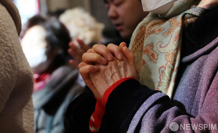 [서울=뉴스핌] 사진공동취재단 = 성탄절인 25일 서울 중구 명동대성당에서 열린 성탄 대축일 낮 미사에서 신도들이 기도 하고 있다. 2025.12.25 photo@newspim.com