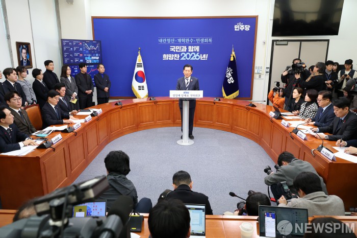 [서울=뉴스핌] 정일구 기자 = 정청래 더불어민주당 대표가 26일 오전 서울 여의도 국회에서 열린 기자회견에서 발언을 하고 있다. 2025.12.26 mironj19@newspim.com