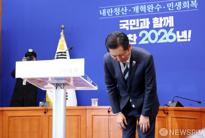 [서울=뉴스핌] 정일구 기자 = 정청래 더불어민주당 대표가 26일 오전 서울 여의도 국회에서 열린 기자회견에서 인사를 하고 있다. 2025.12.26 mironj19@newspim.com