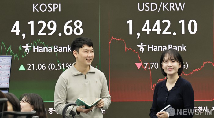 한국거래소에 따르면 이날 코스피 지수는 전 거래일 대비 21.06포인트(0.51%) 오른 4129.68에 마감했다. 외국인과 기관이 각각 1조7623억원, 4665억원 어치 순매수했고 개인은 2조2865억원 어치 순매도했다.
