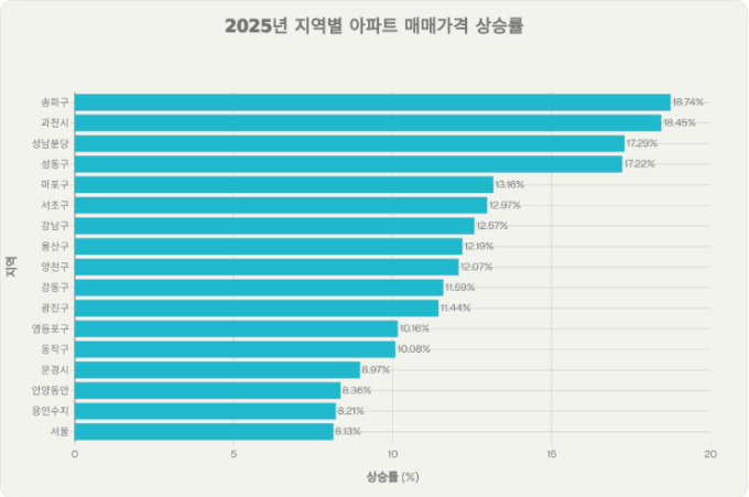 27일 한국부동산원 부동산통계시스템에 따르면 지난해 12월 30일부터 올해 12월 22일까지 서울 아파트 매매값은 8.13% 상승했다. 기초자치단체 중 송파구는 18.74% 상승하며 전국 최고치를 나타냈다. 송파구는 지난 3월 구내 전 아파트가 토지거래허가구역으로 지정되며 거래가 제한됐음에도, 잠실과 신천동 일대 아파트 가격은 꾸준히 상승했다.