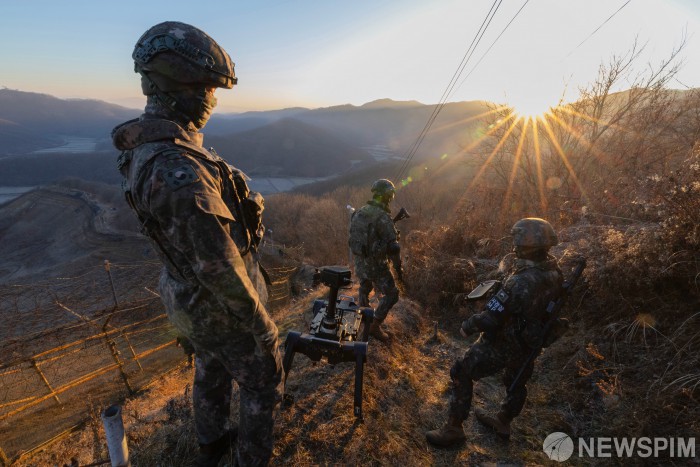 [연천=뉴스핌] 류기찬 기자 = 철책선 넘어 밝아오는 태양 아래, 군은 새로운 전투 시대를 맞이하고 있다. 지난 22일 오전 경기 연천군 5사단 열쇠부대 군 장병들이 지난해부터 대테러작전·수색·정찰 등 다양한 군사 임무에서 시범운용중인 다족 보행 로봇과 함께 철책 경계 근무에 나섰다. 다족 보행 로봇은 육군이 추진 중인 차세대 전투체계 '아미 타이거' 전투실험의 하나로 또 다른 전투원 역할을 수행하기 위해 투입됐다. 2025.12.29 ryuchan0925@newspim.com