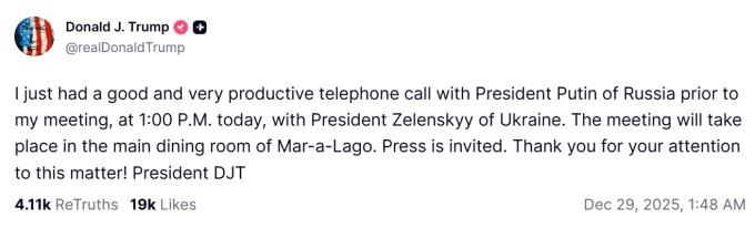 트럼프 대통령은 소셜미디어 트루스소셜을 통해 "방금 푸틴 대통령과 아주 생산적이고 좋은 전화 통화를 했다"면서 푸틴 대통령이 전쟁 종식에 대해 "매우 진지하다"고 말했다고 했다.