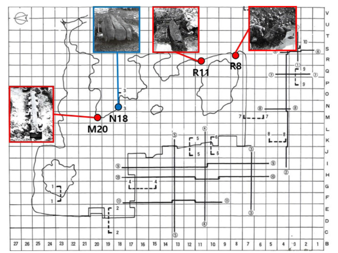 [서울=뉴스핌] 이지은 기자 = 월지 출토 목선 부재 출토 위치(파랑 박스: 완형 목선, 빨강 박스: 목선편). [사진=국립중앙박물관]  2025.12.29 alice09@newspim.com