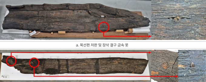 그 결과, 목선의 선수 및 선미부 장삭 각 2지점, 현측재 최소 4지점에 철을 주성분으로 제작한 철제 못이 확인됐다. 또한 목선의 3열 저판 및 현측재는 소나무속 소나무류, 선수 및 선미부 결구 장삭은 참나무속 상수 리나무아속 으로 식별됐으며 향후 소장품의 전시 및 활용을 위하여 보존처리했다.