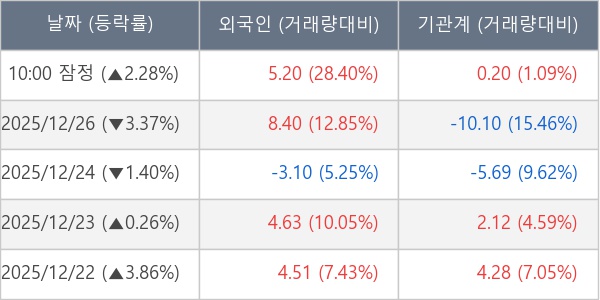 [서울=뉴스핌] 로보뉴스 = 29일 10시 15분 현재 후성(093370)은 외국인과 기관이 각각 5.20 만 주, 0.20 만 주 순매수(잠정) 하면서 전일 대비 2.28% (현재가 7,630원) 상승하고 있다.