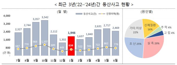 겨울철에는 추운 날씨 등으로 산행 인구가 줄어들면서 사고 발생도 감소하는 경향을 보였지만, 1월에는 새해를 맞아 산에 오르는 사람이 늘며 겨울철 중 가장 많은 등산사고(1946건)와 인명피해(634명)가 발생했다.