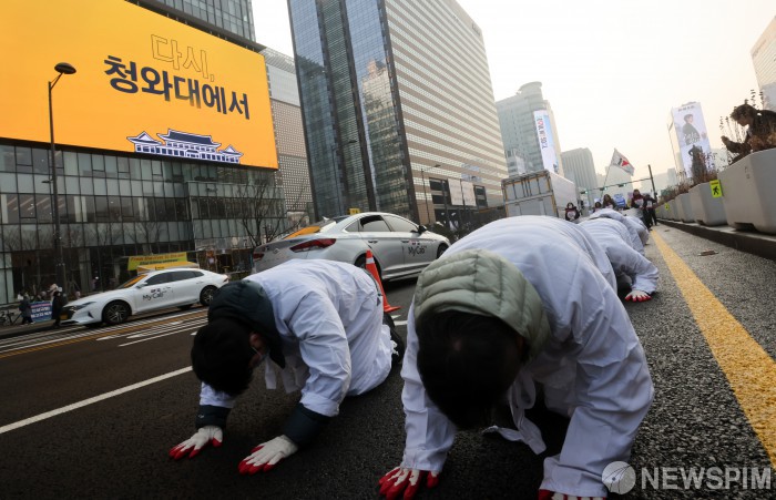 [서울=뉴스핌] 최지환 기자 = 청와대 비정규직 노동자들이 29일 서울 종로구 광화문광장에서 고용 보장을 촉구하며 청와대로 삼보일배하고 있다. 2025.12.29 choipix16@newspim.com