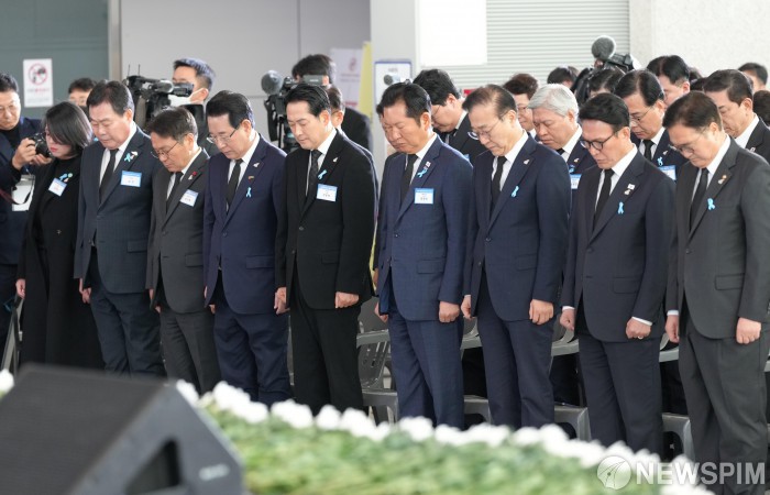 [무안=뉴스핌] 조은정 기자 = 김영록 전남도지사가 29일 무안국제공항에서 열린 '12·29 제주항공 여객기 참사 1주기 추모식'에서 김민석 국무총리를 비롯한 국회의장, 당대표들과 묵념하고 있다. [사진=전남도] 2025.12.29 ej7648@newspim.com