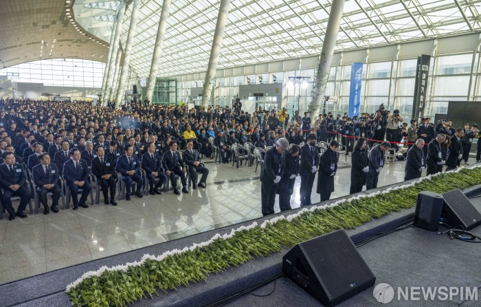 [서울=뉴스핌] 사진공동취재단 = 12.29 제주항공 여객기 참사 1주기인 29일 오전 전남 무안군 무안국제공항에서 열린 '12.29 제주항공 여객기 참사 1주기 추모식'에서 김유진 유가족협의회 대표를 비롯한 유가족들이 희생자들을 기리며 묵념하고 있다. 2025.12.29 photo@newspim.com