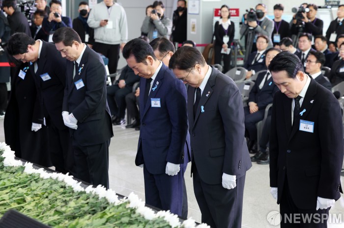 [서울=뉴스핌] 29일 무안국제공항에서 열린 ‘12.29 제주항공 여객기 참사 1주기 추모식’에서 우원식 국회의장과 정청래 더블어민주당 당대표, 장동혁 국민의힘대표 등이 묵념을 하고 있다. [사진동동취재단] 2025.12.29 photo@newspim.com