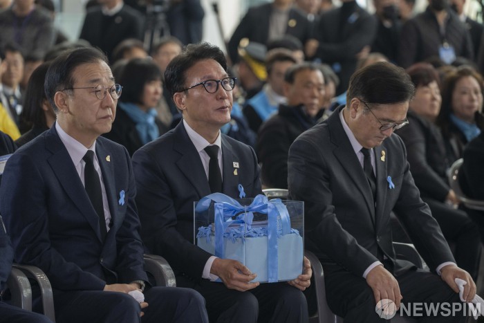 [서울=뉴스핌] 사진공동취재단 = 김민석 국무총리가 29일 무안국제공항에서 열린 12.29 제주항공 여객기 참사 1주기 추모식에서 유가족들의 염원이 담긴 편지함을 받아들고 있다. 2025.12.29 photo@newspim.com