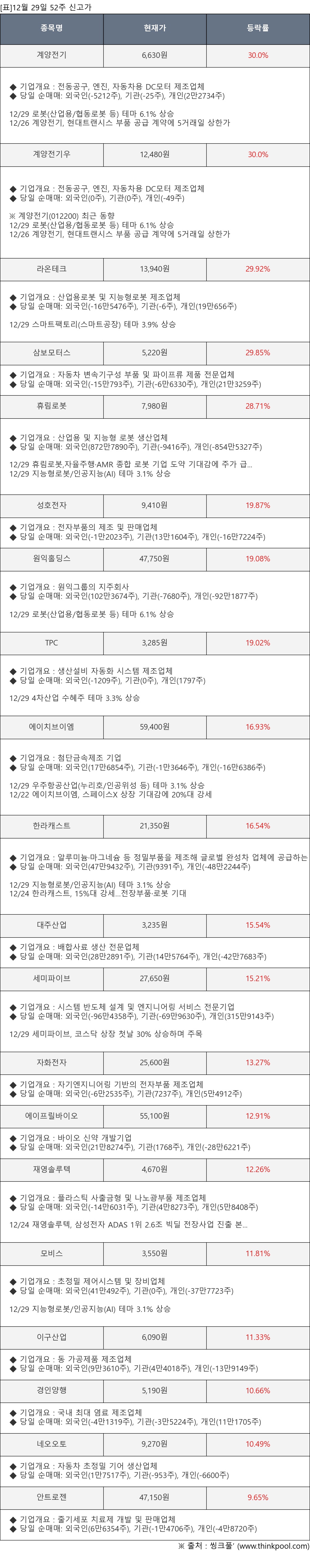 ※ 관련 종목: 계양전기, 계양전기우, 라온테크, 삼보모터스, 휴림로봇, 성호전자, 원익홀딩스, TPC, 에이치브이엠, 한라캐스트, 대주산업, 세미파이브, 자화전자, 에이프릴바이오, 재영솔루텍, 모비스, 이구산업, 경인양행, 네오오토, 안트로젠