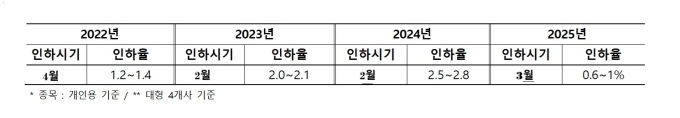 [서울=뉴스핌] 이윤애 기자 = 자동차보험료 인하율 추이 [표=손해보험협회]2025.12.29 yunyun@newspim.com