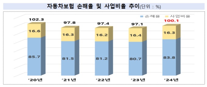 [서울=뉴스핌] 이윤애 기자 = 자동차보험 손해율 및 사업비율 추이 [표=금융감독원] 2025.12.29 yunyun@newspim.com