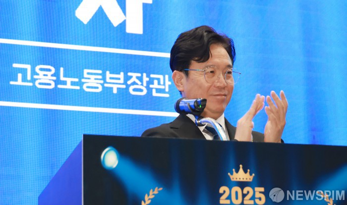[서울=뉴스핌] 김영훈 고용노동부 장관이 29일 오후 청주 오스콘 컨벤션센터에서 열린 올해의 고용서비스상 시상식에서 박수를 치고 있다. [사진=고용노동부] 2025.12.29 photo@newspim.com