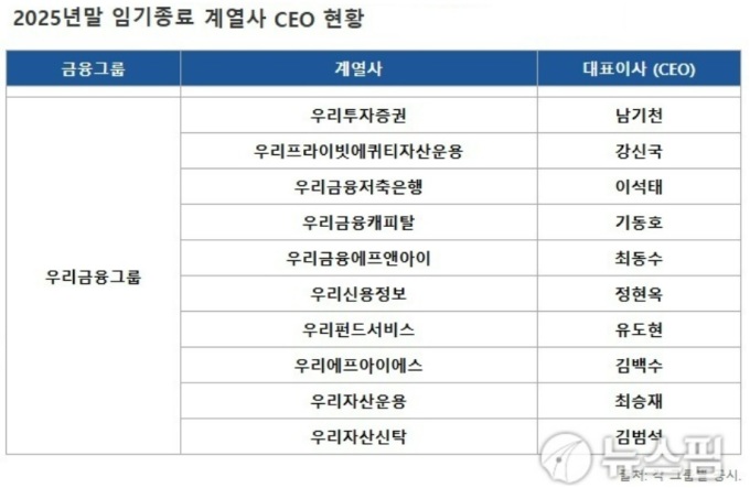 임 회장 연임이 확정됨에 우리금융 계열사 CEO 인사도 곧 이뤄질 전망이다. 4대 금융그룹 중 가장 많은 10명의 CEO가 임기가 종료되는만큼, 얼마나 큰 폭의 변화를 추진하느냐가 향후 임종룡 2기의 향뱡을 가늠할 수 있는 기준이 될 것으로 보인다.