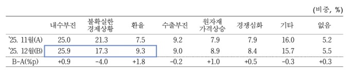 기업들이 꼽은 경영 애로사항으로는 '내수 부진'이 가장 높은 비중을 차지했다. 이어 불확실한 경제 상황과 환율 부담이 주요 애로 요인으로 지목됐다. 특히 환율 부담 응답 비중은 전월보다 확대된 반면, 불확실한 경제 상황에 대한 응답 비중은 다소 줄었다.