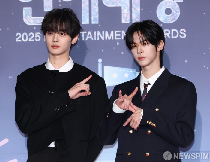 [서울=뉴스핌] 최지환 기자 = '쇼! 음악중심' 출연진 제로베이스 김규빈(왼쪽), 투어스 도훈이 29일 오후 서울 마포구 MBC 미디어센터에서 열린 2025 MBC 방송연예대상 시상식 포토월에서 포즈를 취하고 있다. 2025.12.29 choipix16@newspim.com
