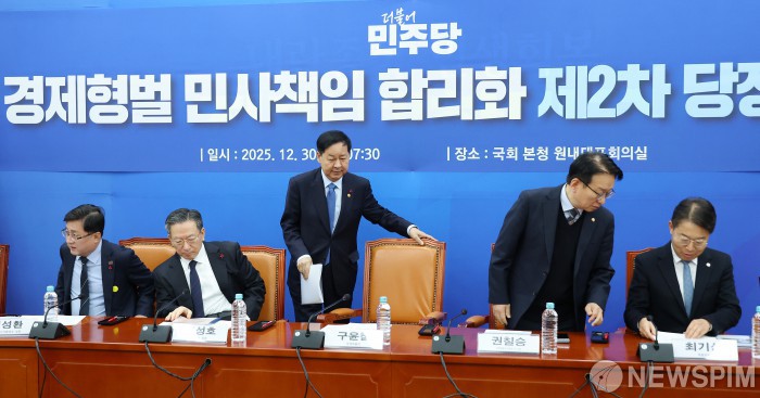 [서울=뉴스핌] 정일구 기자 = 권칠승 경제형벌민사책임 TF 단장과 구윤철 부총리 겸 기획재정부 장관을 비롯한 각 부처 장관들과 경제형벌 TF 위원들이 30일 오전 서울 여의도 국회에서 열린 경제형벌 민사책임 합리화 제2차 당정협의에 참석하고 있다. 2025.12.30 mironj19@newspim.com