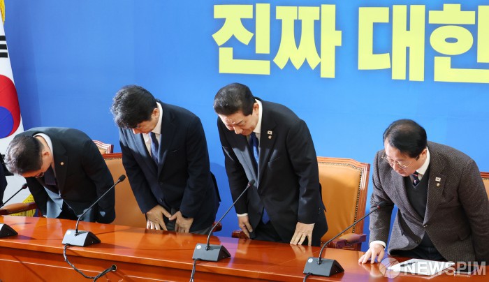 [서울=뉴스핌] 정일구 기자 = 원내대표직 사퇴 의사를 밝힌 김병기 더불어민주당 원내대표가 30일 오전 서울 여의도 국회에서 열린 원내대책회의에서 인사하고 있다. 2025.12.30 mironj19@newspim.com