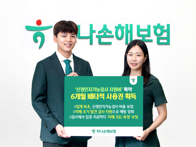 [서울=뉴스핌] 이윤애 기자 = 하나손해보험은 '하나더넥스트 치매간병보험'에 신규로 개발한 '신경인지기능검사 지원비 보장 특약'으로 6개월간 배타적 사용권을 획득했다고 30일 밝혔다.
