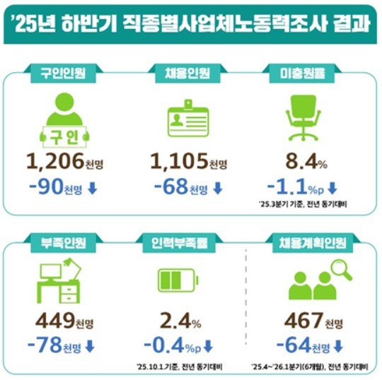 이 관계자는 "구인과 채용이 줄면서 미충원이 줄었다는 의미는 구인 수요가 줄었다는 것"이라며 "부족인원도 줄어 채용 계획도 좋지 못한 것으로 해석된다"고 설명했다.