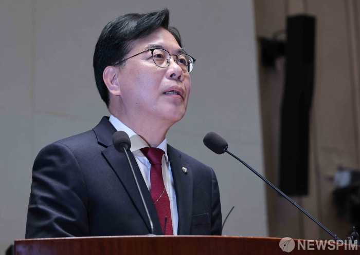 [서울=뉴스핌] 윤창빈 기자 = 송언석 국민의힘 원내대표가 30일 서울 여의도 국회에서 열린 의원총회에서 모두발언을 하고 있다. 2025.12.30 pangbin@newspim.com