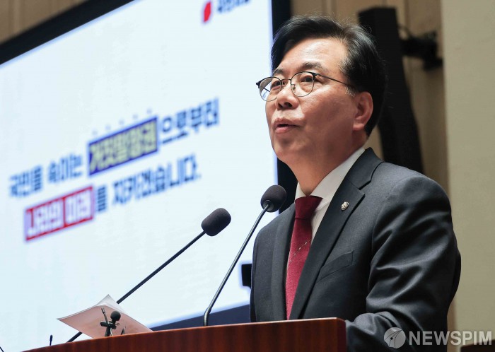 [서울=뉴스핌] 윤창빈 기자 = 송언석 국민의힘 원내대표가 30일 서울 여의도 국회에서 열린 의원총회에서 모두발언을 하고 있다. 2025.12.30 pangbin@newspim.com