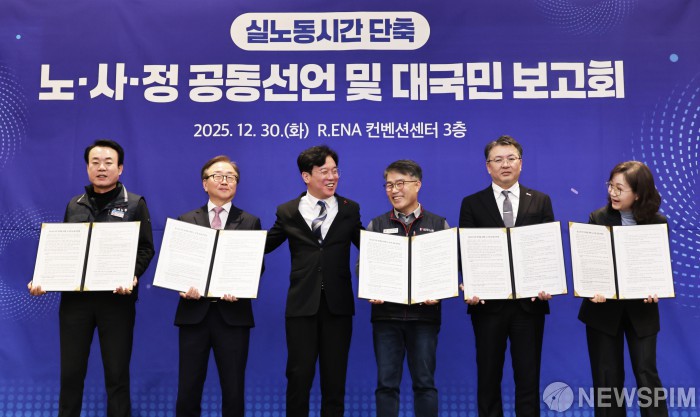 [서울=뉴스핌] 양윤모 기자 = 김영훈 고용노동부장관이 30일 오후 서울 중구 ENA스위트호텔에서 개최된 '실노동시간 단축 로드맵 추진단 대국민 보고회'에서 노·사·정이 실노동시간 단축 합의서에 서명후 함께 기념촬영을 하고 있다. 2025.12.30 yym58@newspim.com
