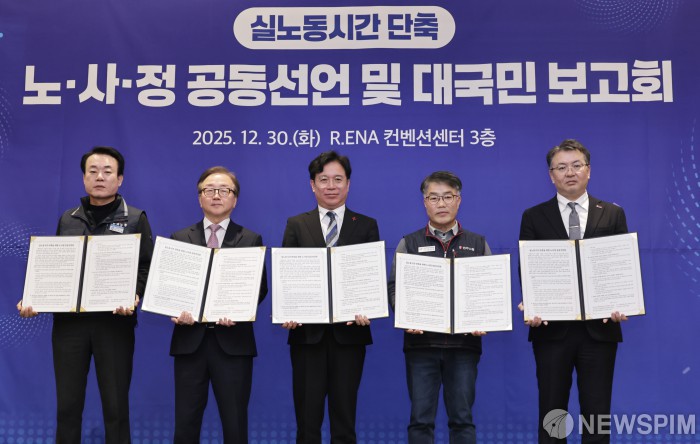 [서울=뉴스핌] 양윤모 기자 = 김영훈 고용노동부장관이 30일 오후 서울 중구 ENA스위트호텔에서 개최된 '실노동시간 단축 로드맵 추진단 대국민 보고회'에서 노·사·정이 실노동시간 단축 합의서에 서명후 함께 기념촬영을 하고 있다. 2025.12.30 yym58@newspim.com