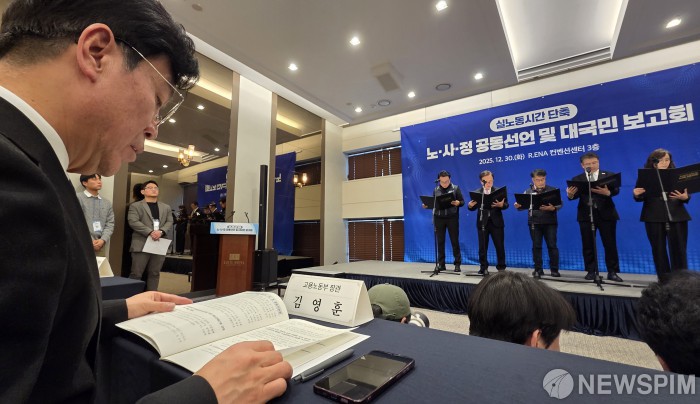 [서울=뉴스핌] 양윤모 기자 = 김영훈 고용노동부장관이 30일 오후 서울 중구 ENA스위트호텔에서 개최된 '실노동시간 단축 로드맵 추진단 대국민 보고회'를 확인하고 있다. 2025.12.30 yym58@newspim.com