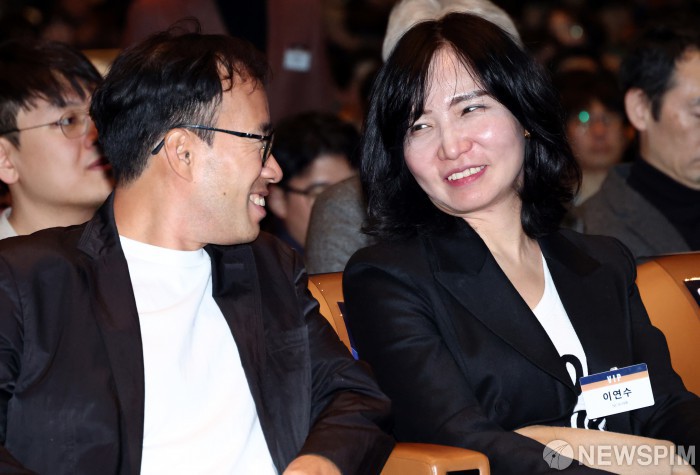[서울=뉴스핌] 최지환 기자 = 이연수 NC AI 대표(오른쪽), 김성훈 업스테이지 대표가 30일 오후 서울 강남구 코엑스에서 열린 '독자 AI 파운데이션 모델' 프로젝트 1차 발표회에서 대화흘 나누고 있다. 2025.12.30 choipix16@newspim.com