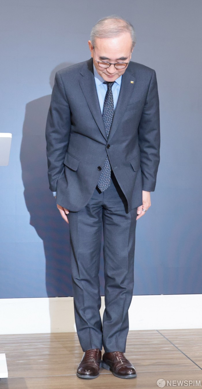 [서울=뉴스핌] 이길동 기자 = 김영섭 KT 대표이사가 30일 오후 서울 종로구 KT 광화문빌딩 웨스트에서 열린 KT 침해사고 관련 대고객 사과와 정보보안 혁신방안 기자브리핑에 앞서 고개 숙여 사과를 하고 있다. 2025.12.30 gdlee@newspim.com